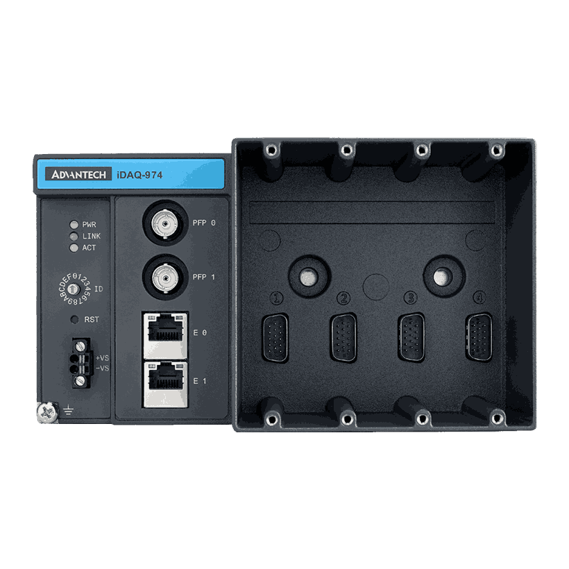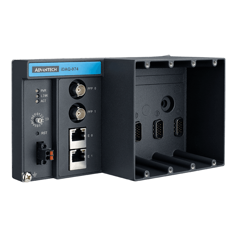 iDAQ‑974 er et robust, modulært og Ethernet‑basert datainnsamlingssystem (DAQ) utviklet for industriell bruk der fleksibilitet, hastighet og pålitelighet er avgjørende. Det kompakte 4‑slot‑kabinettet kommuniserer over Ethernet med støtte for daisy chain, slik at flere enheter kan kobles i serie uten behov for ekstra hub eller switch.