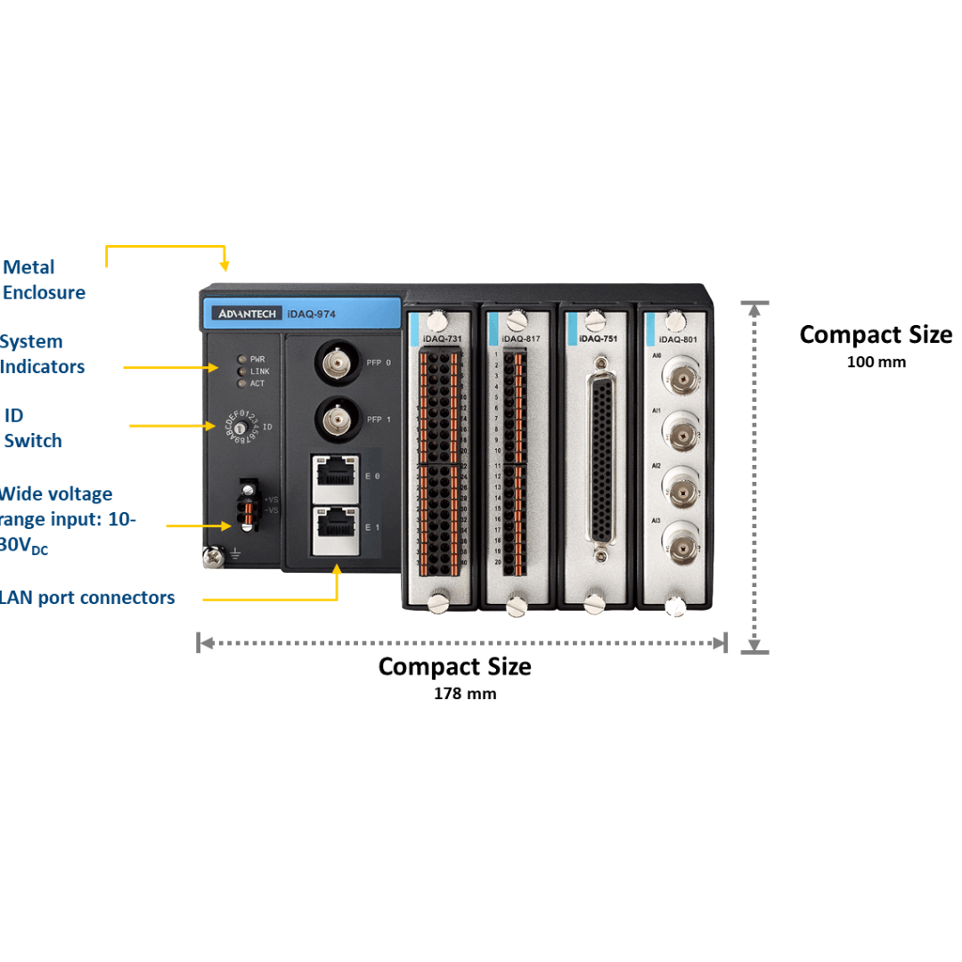 Med sitt robuste design, temperaturoperasjonsområde ned til –40 °C, høy EMC‑immunitet og fleksible monteringsmuligheter er iDAQ‑974 et ideelt valg for industriell testing, overvåkning og datainnsamling, der nøyaktig tidsstyring og høy målehastighet er kritisk.