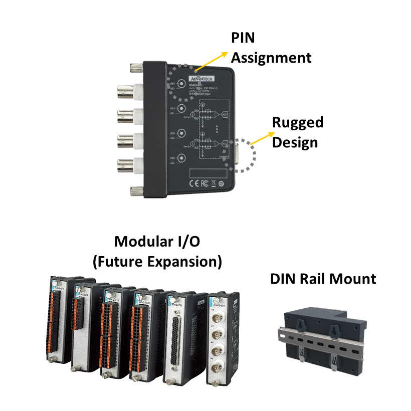iDAQ‑systemet muliggjør synkronisert måling på tvers av ulike moduler og integrerer enkelt vibrasjons-, temperatur-, belastnings- samt analoge og digitale signaler i tilpassede oppsett.