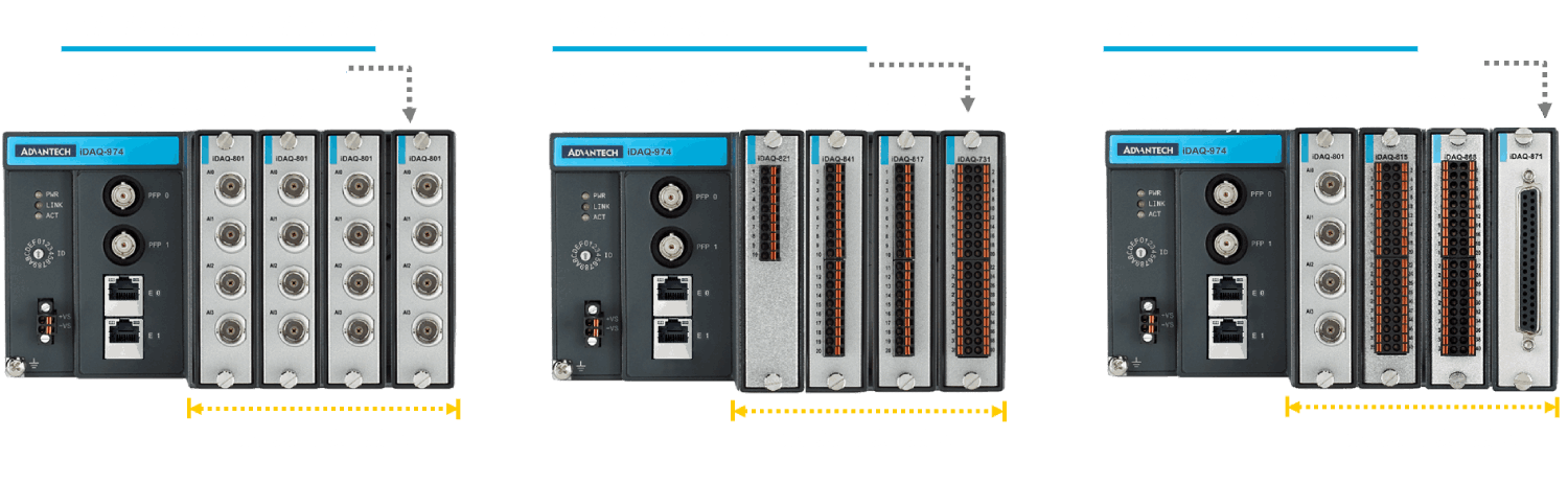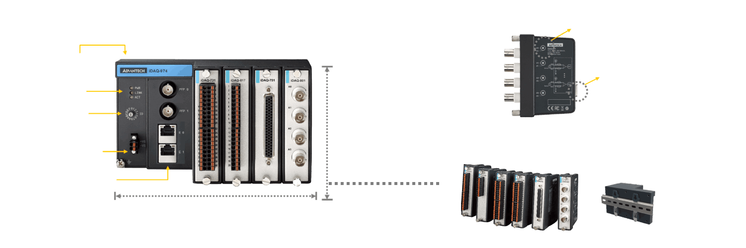 iDAQ‑974 støtter et bredt utvalg av iDAQ‑moduler som dekker analoge, digitale og vibrasjonsrelaterte målebehov. De innebygde, programmerbare funksjonspinnene for trigger- og klokkesignaler gir presis timingstyring og synkronisering av måleprosesser.